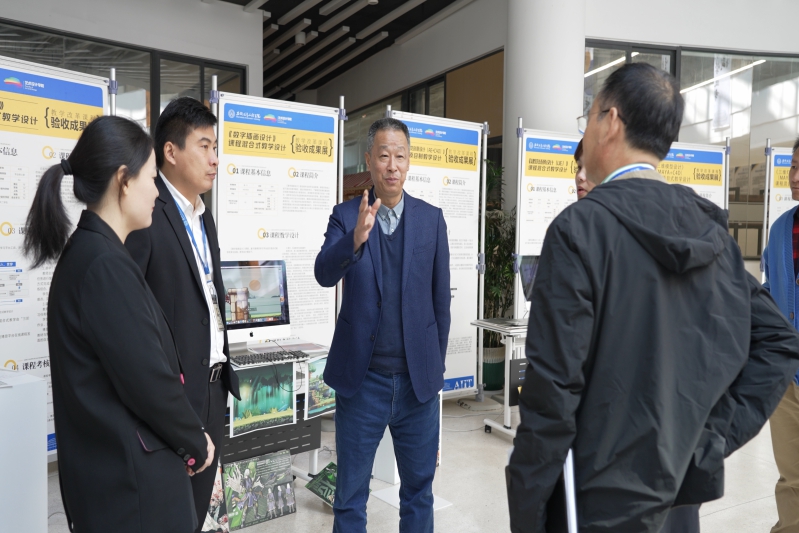 为进一步做好项目制课程与混合式课程建设工作,全面总结学科建设经验。11月6日,艺术设计学院在艺术楼一楼展厅举办了项目制和混合式课程教改课程验收成果展。成果展邀请了校长吴敏、副校长朱尚玉、教育质量与评估办公室主任兼教务处副处长程玉林、教务处副处长孙怡川参加了课程验收成果展,艺术设计学院副院长周建、钱琳、骆琼、课程建设负责人教师以及部分骨干教师参加了展出并交流经验。(图为吴校长亲临成果展现场) 成果展上,艺术设计学院共建设项目制课程与混合式课程共61门,其中达到优秀的教改课程12门,良好31门,优良率达到70%。艺术设计学院以本次课程验收成果展为契机,进一步加强项目制和混合式课程建设的执行和监督力度与推广力度,课程负责人严格对照课程建设要求,完善课程目标,优化课程内容,创新课程设计,丰富课程资源,加强课程应用,注重课程考核,做好课程的持续改进与迭代完善。(图为成果展现场)    课程负责人分别就项目制与混合式课程做了系统交流分享,邢龙老师从项目教学设计、项目实施过程、考核与评价、问题与反