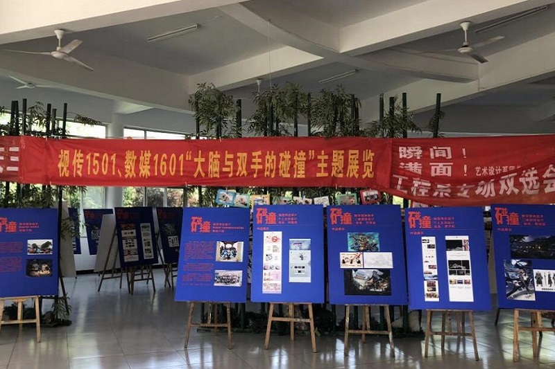 5月16日,艺术设计学院视觉传达1501班和数字媒体技术1601班在文津校区食堂一楼联合举办了主题为“碰撞”的设计展,用自己的大脑与双手碰撞出了不一样的花火,给我校师生带来了“视觉上的冲击”。   (图为艺术设计学院设计展现场图) 此次作品展为网页设计与二维数字游戏设计的课程作业成果,由段俐敏老师指导,15级视觉传达专业与16级数字媒体技术专业全体学生共同完成。展出的网页设计包含摄影、旅游、个人主页等内容,二维数字游戏设计包含人设、场景、数字插画等内容,课程作业通过丰富的色彩与多种设计风格展现出精美的作品,彰显了学生的个性设计和大胆创想。  (图为艺术设计学院设计展现场图) 通过此次作品展,学生们不仅提高了自信心,同时也向全校师生展现出两个专业的特色。 (文/万灵运  图/段俐敏  核/杨爽  审/叶克军 )