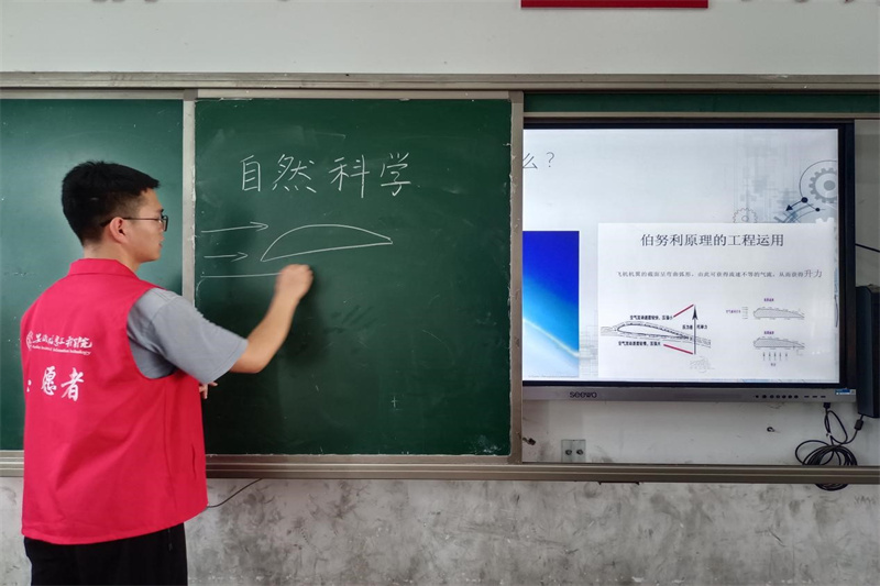 本网讯 为落实教育部办公厅、中国科协办公厅关于利用科普资源助推“双减”工作的政策要求,营造良好的“双减”校园氛围,点亮乡村儿童心中的科学梦想。2022年7月14日上午8时,安徽信息工程学院“七彩假期”支教团博雅分队在校团委的指导下,来到阜阳市阜南县于集乡程楼小学,开展以“科普支教助双减”为主题的支教活动。(图为志愿者为孩子们讲述科学实验)课程伊始,志愿者向孩子们展示了飞机模型,并通过演示飞机模型滑翔来激发孩子们对实验的兴趣。接着,志愿者为孩子们播放了飞机成功起飞的视频,并引领孩子们自主思考飞机能够平稳升空的原因,在孩子们激烈研讨的同时,顺势引入伯努利定律——流速大、压强小的概念。为了易于孩子们理解,志愿者借“有风吹过时,窗帘会向外飘动”、“过堂风”等生活中可见的实例,详细为孩子们阐述了压力差的产生,进而点明了飞机升空原理。随后,为使孩子们亲身体验到压力差的存在,志愿者拿出了吹风机和乒乓球,将乒乓球置于吹风机出风口的位置进行实验。面对稳定置于吹风机上空的乒乓球,孩子们不禁发出感叹,并纷纷举