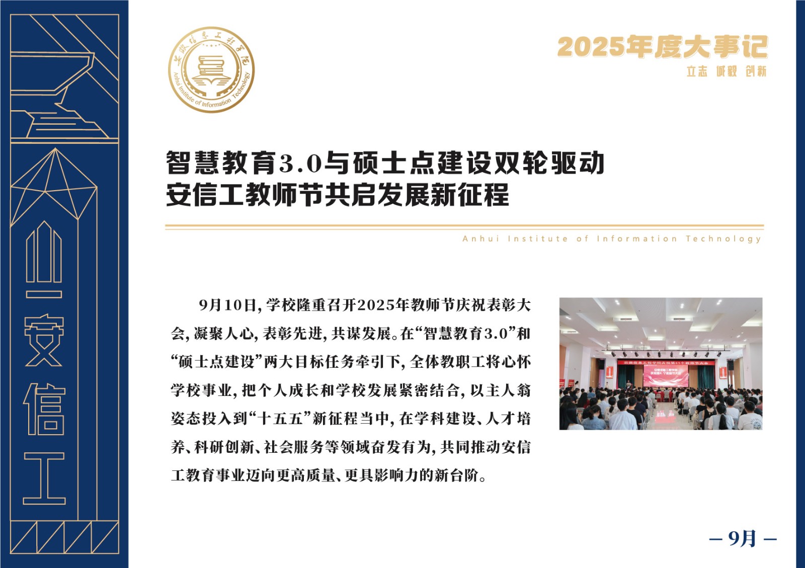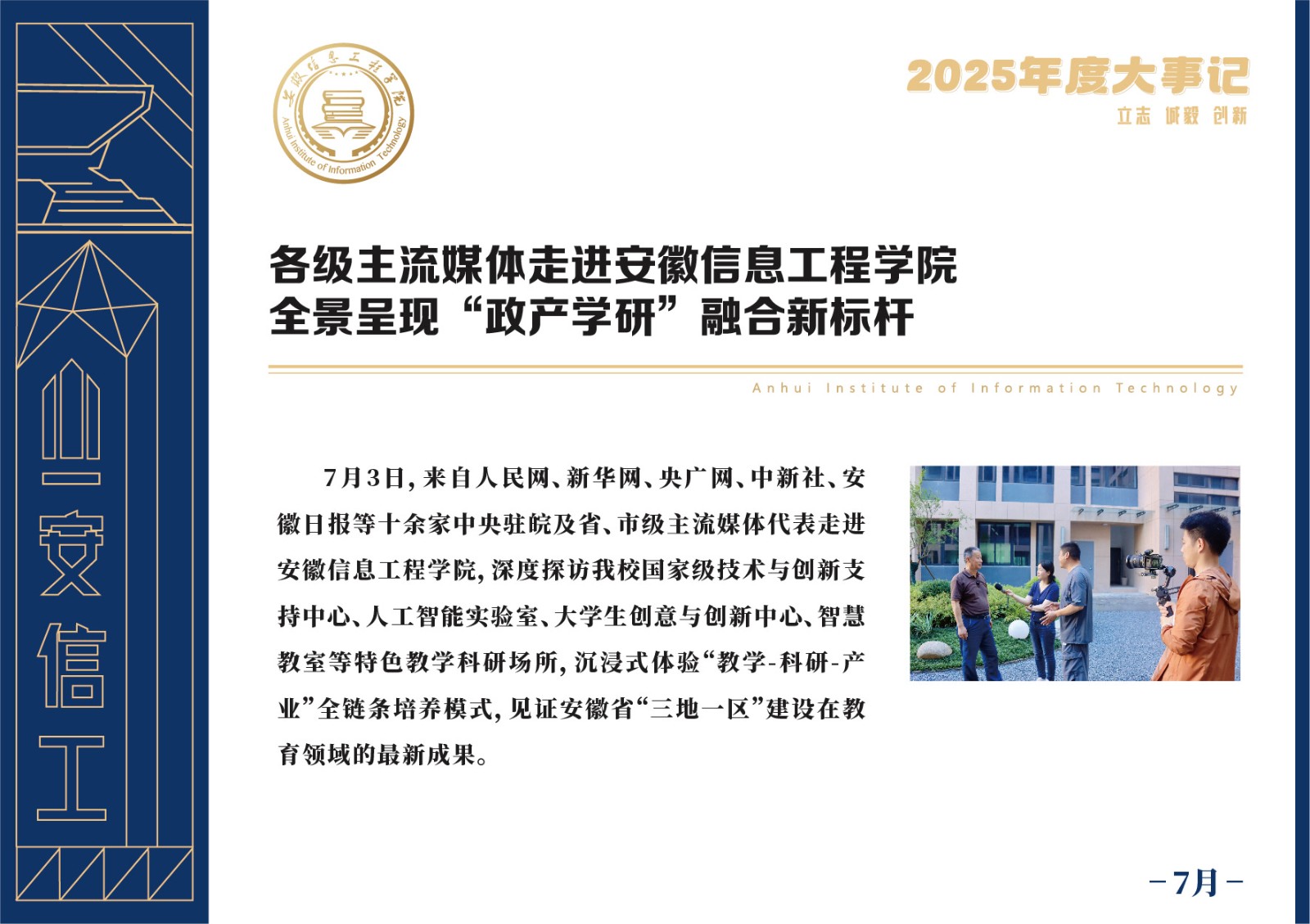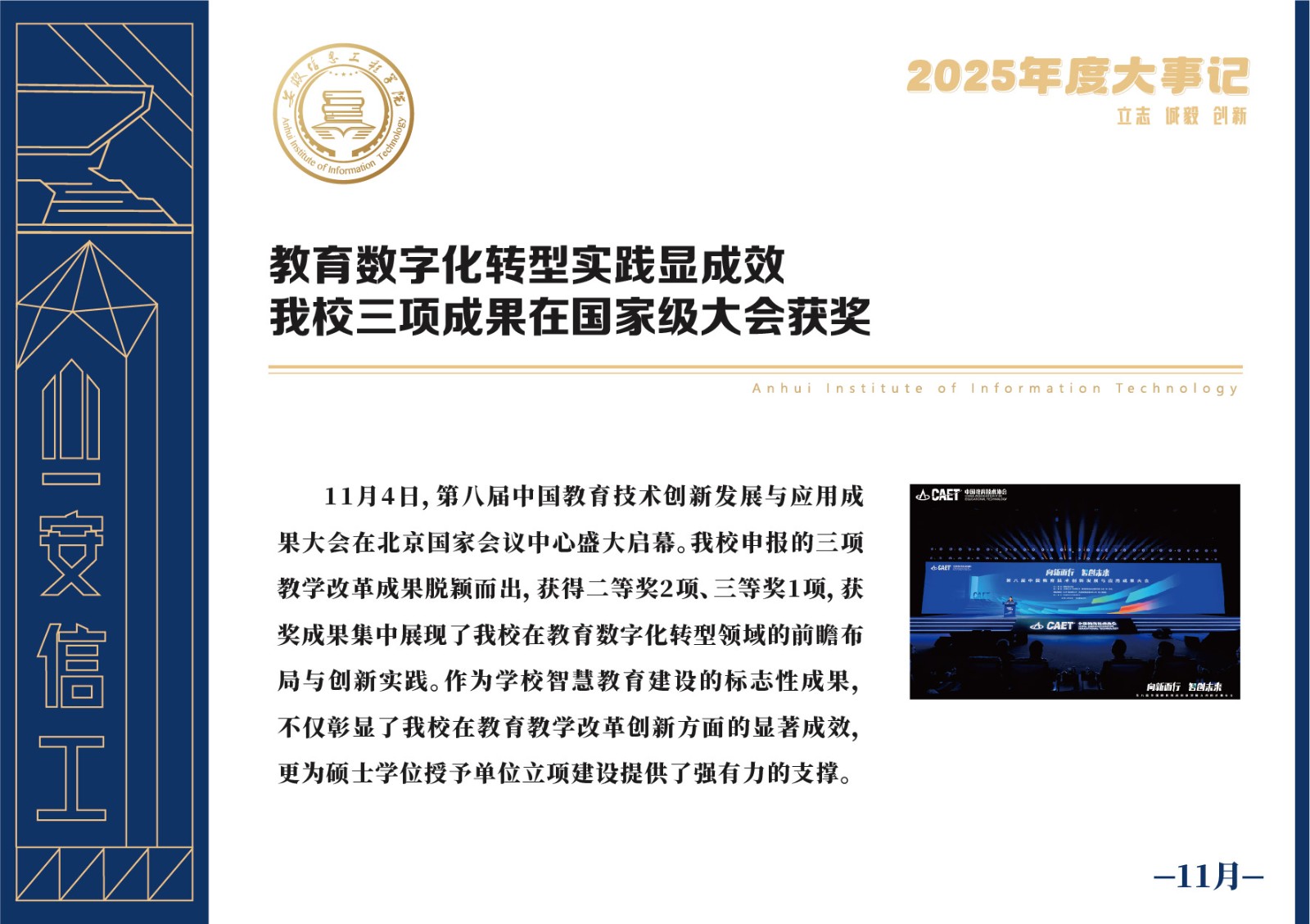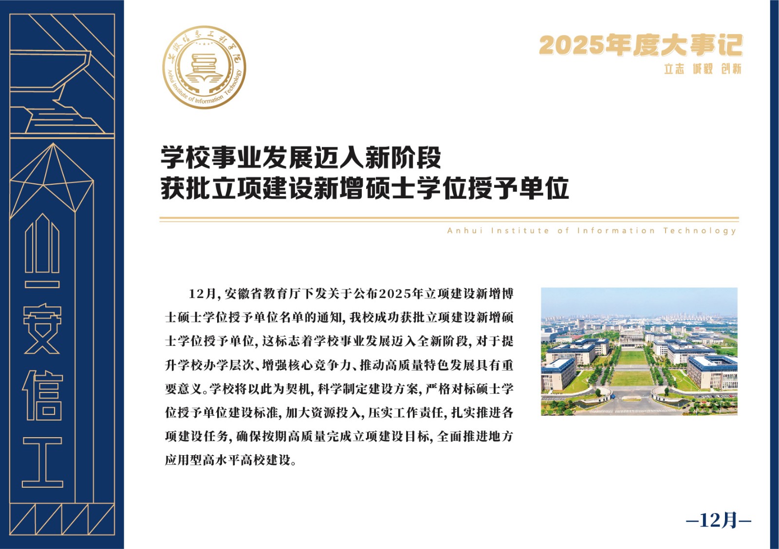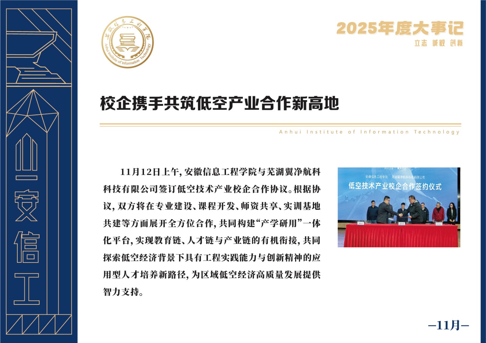 编者按 岁序更迭,华章日新。2025年,是安徽信息工程学院在高质量发展道路上勇攀新峰、跨越前行的一年。这一年,我们高举旗帜、培根铸魂,党的建设坚定有力。这一年,我们聚焦主业、锐意革新,人才培养与教育教学改革结出累累硕果。这一年,我们聚力创新、服务社会,科研能级与学科建设实现历史跨越。这一年,我们以生为本、涵养生态,育人环境与校园文化焕发勃勃生机……每一个事件,都凝聚着信工人的智慧与汗水,每一次跨越,都彰显着学校“为党育人、为国育才”的使命担当。