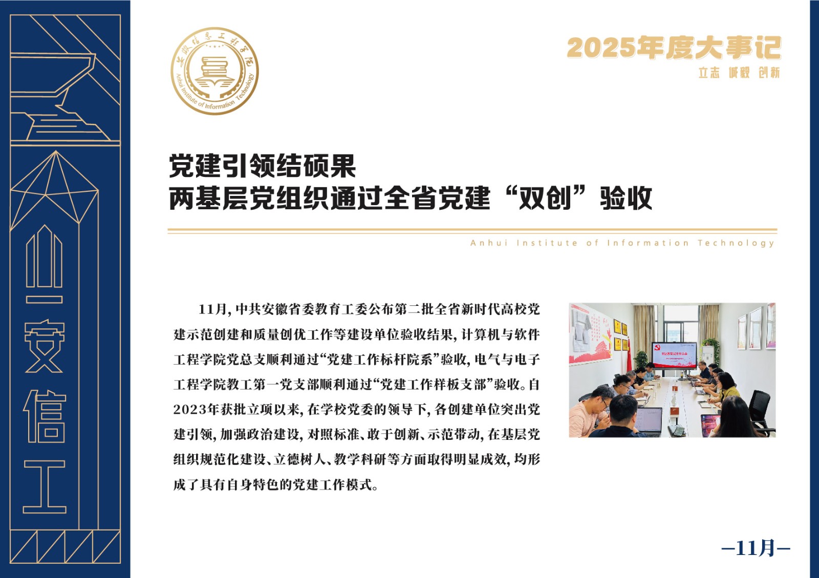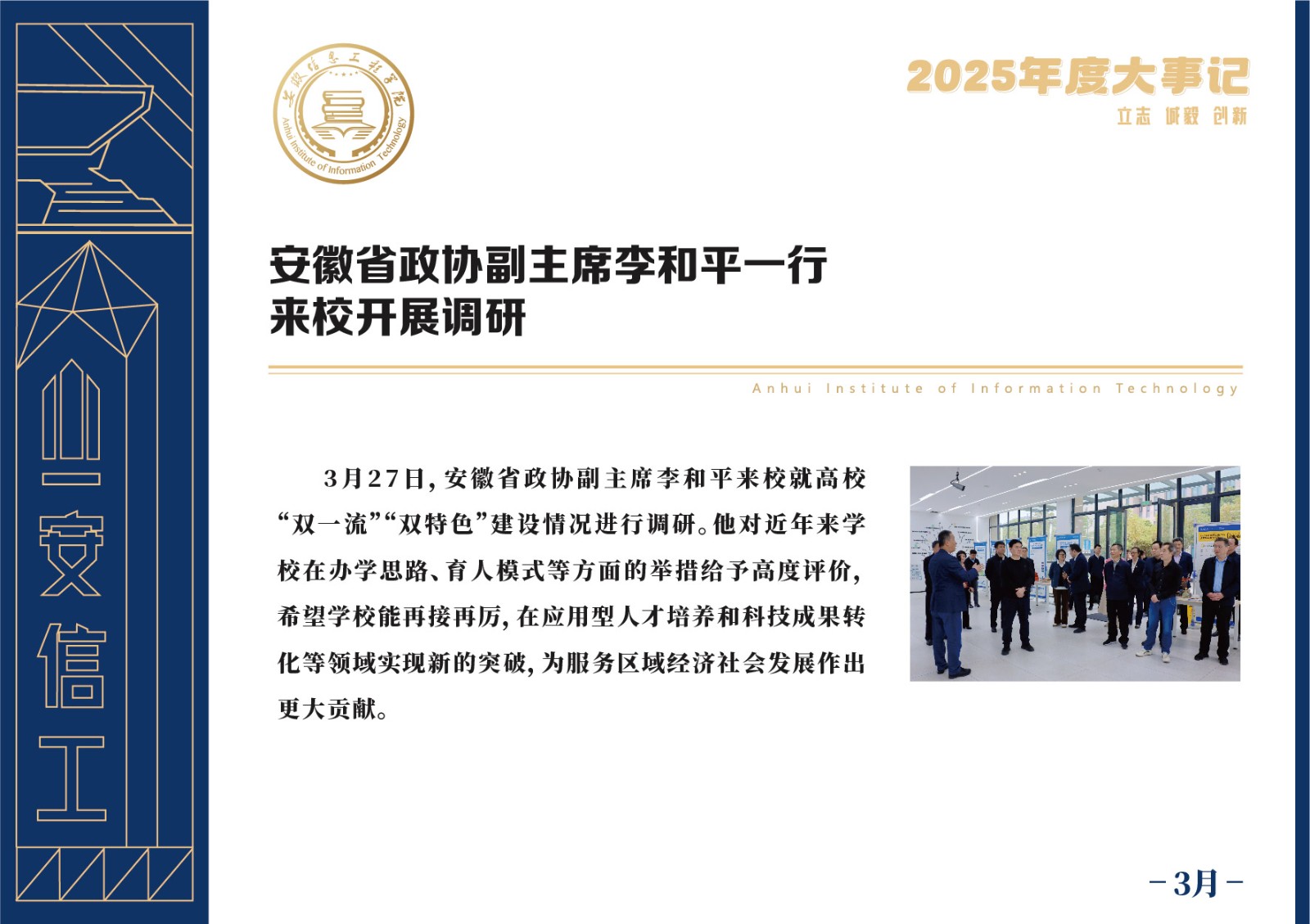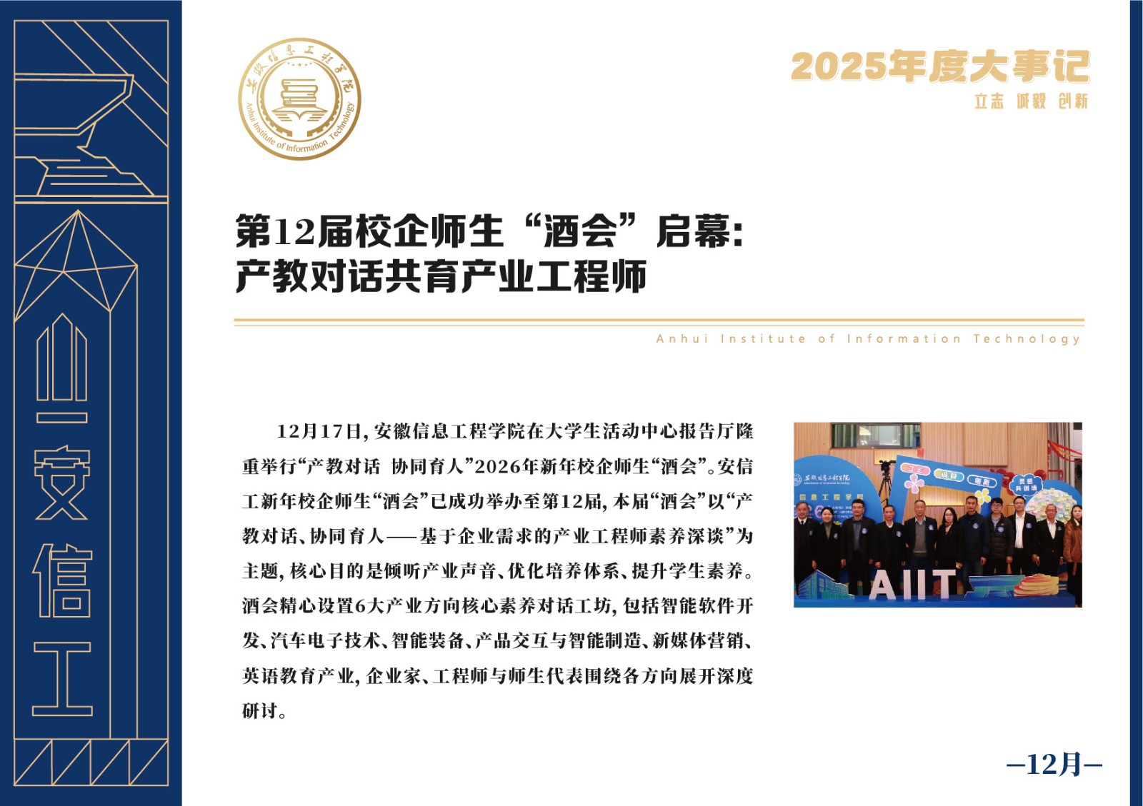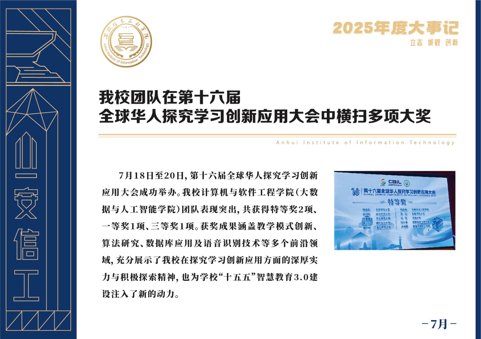 编者按 岁序更迭,华章日新。2025年,是安徽信息工程学院在高质量发展道路上勇攀新峰、跨越前行的一年。这一年,我们高举旗帜、培根铸魂,党的建设坚定有力。这一年,我们聚焦主业、锐意革新,人才培养与教育教学改革结出累累硕果。这一年,我们聚力创新、服务社会,科研能级与学科建设实现历史跨越。这一年,我们以生为本、涵养生态,育人环境与校园文化焕发勃勃生机……每一个事件,都凝聚着信工人的智慧与汗水,每一次跨越,都彰显着学校“为党育人、为国育才”的使命担当。