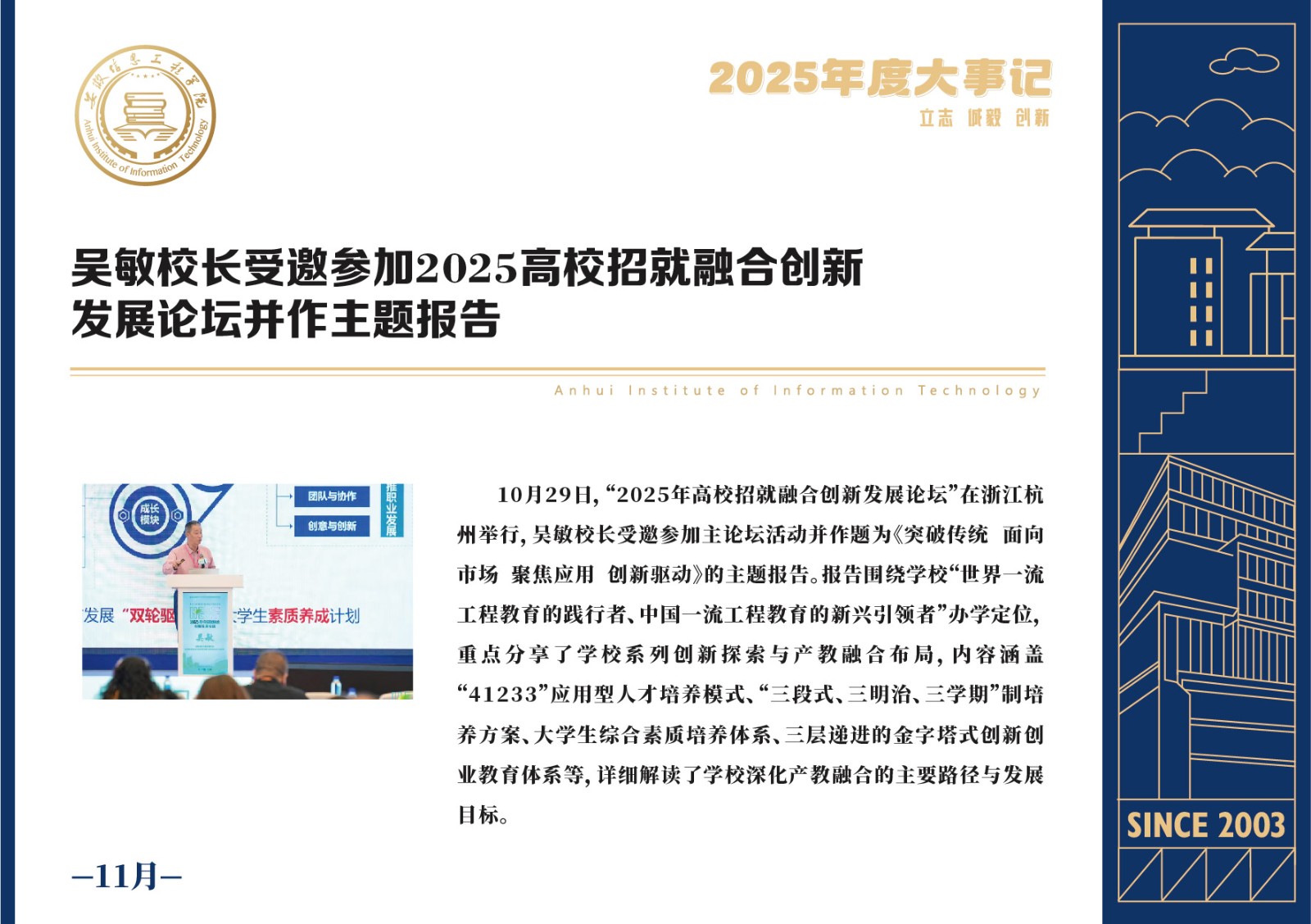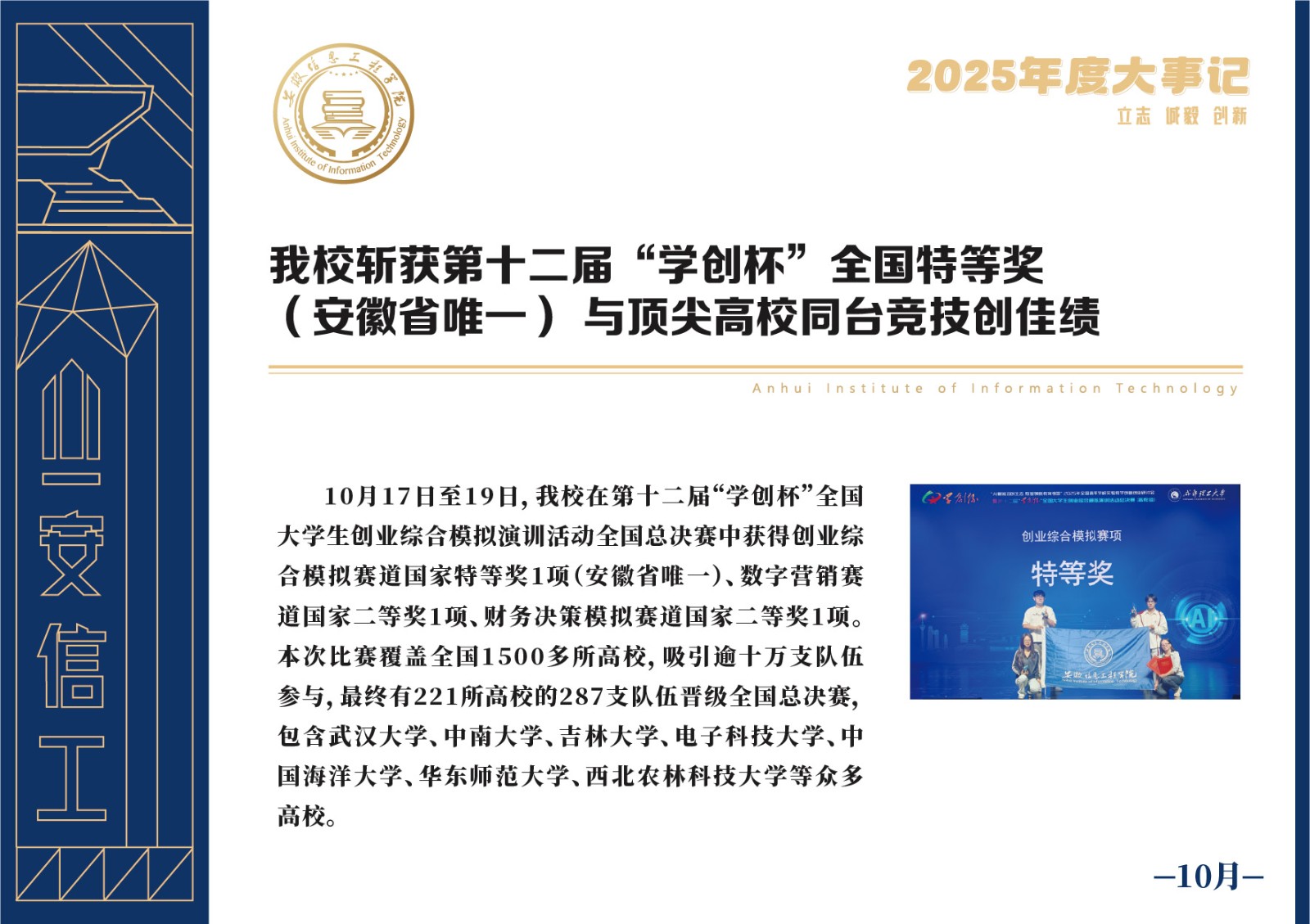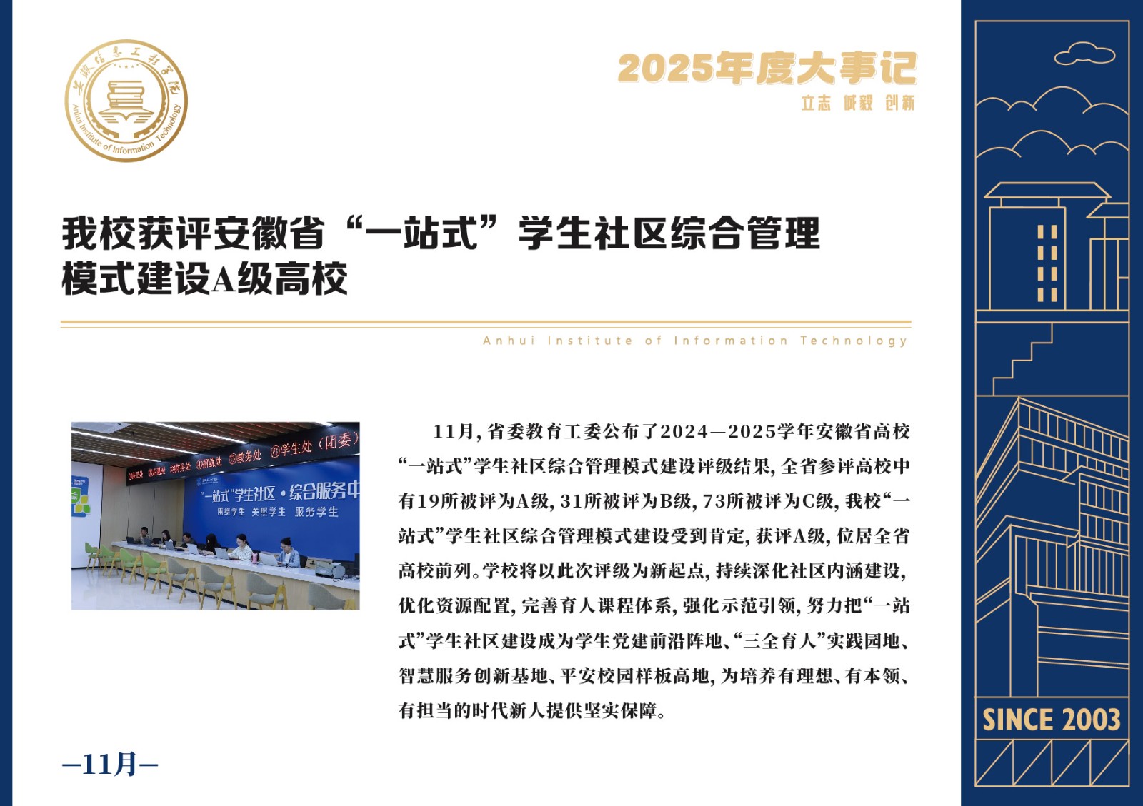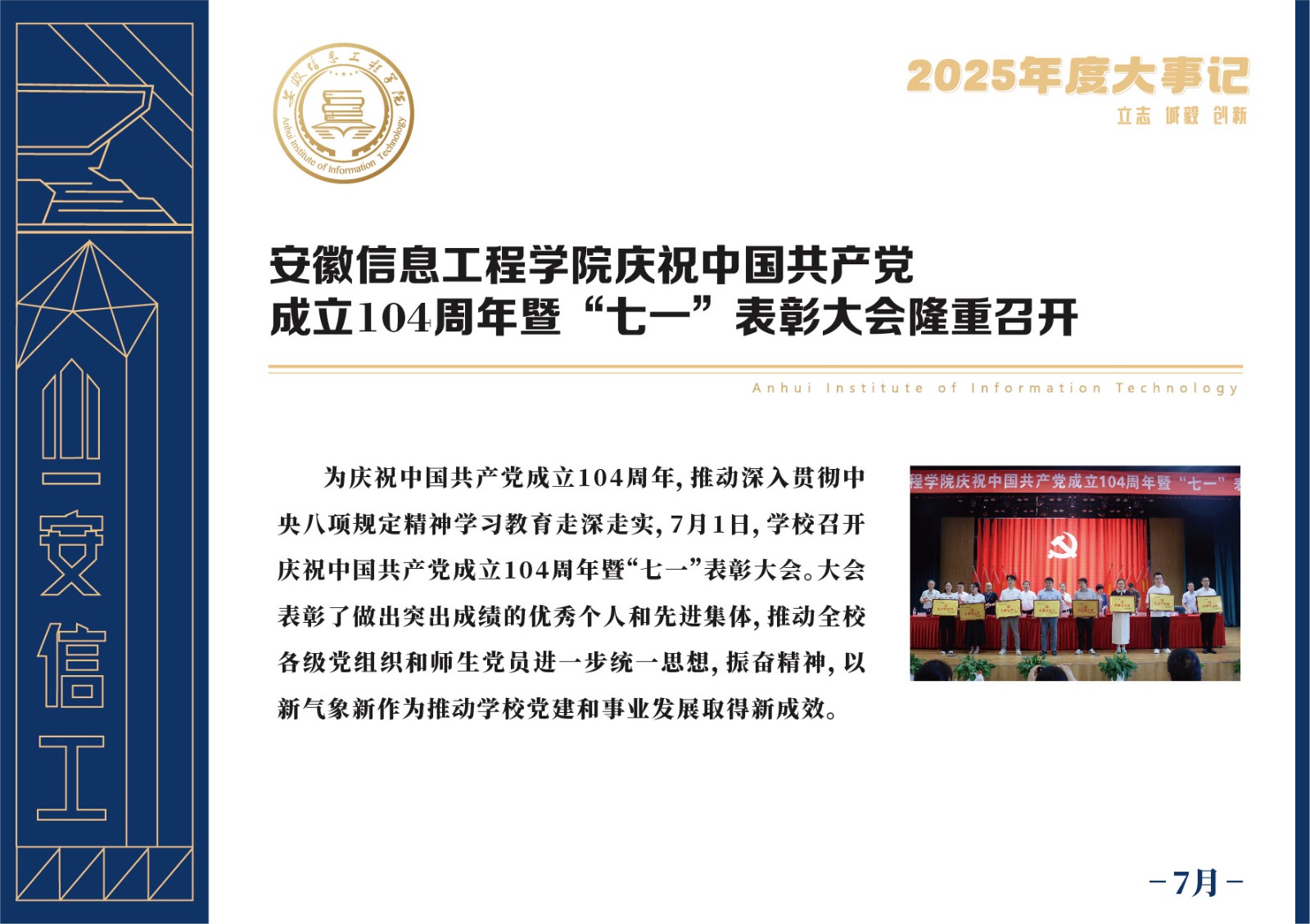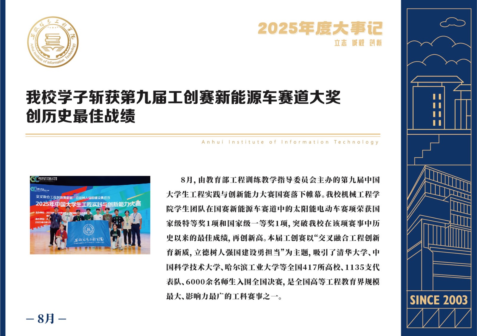 编者按 岁序更迭,华章日新。2025年,是安徽信息工程学院在高质量发展道路上勇攀新峰、跨越前行的一年。这一年,我们高举旗帜、培根铸魂,党的建设坚定有力。这一年,我们聚焦主业、锐意革新,人才培养与教育教学改革结出累累硕果。这一年,我们聚力创新、服务社会,科研能级与学科建设实现历史跨越。这一年,我们以生为本、涵养生态,育人环境与校园文化焕发勃勃生机……每一个事件,都凝聚着信工人的智慧与汗水,每一次跨越,都彰显着学校“为党育人、为国育才”的使命担当。