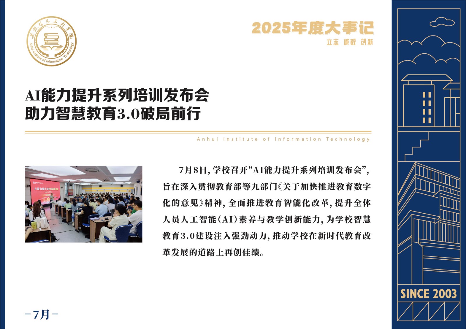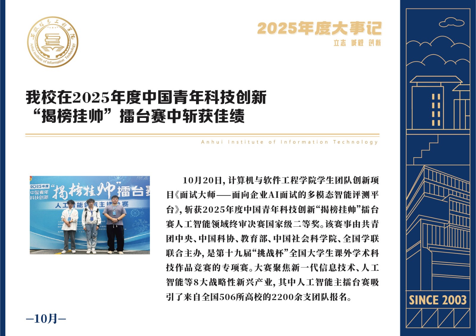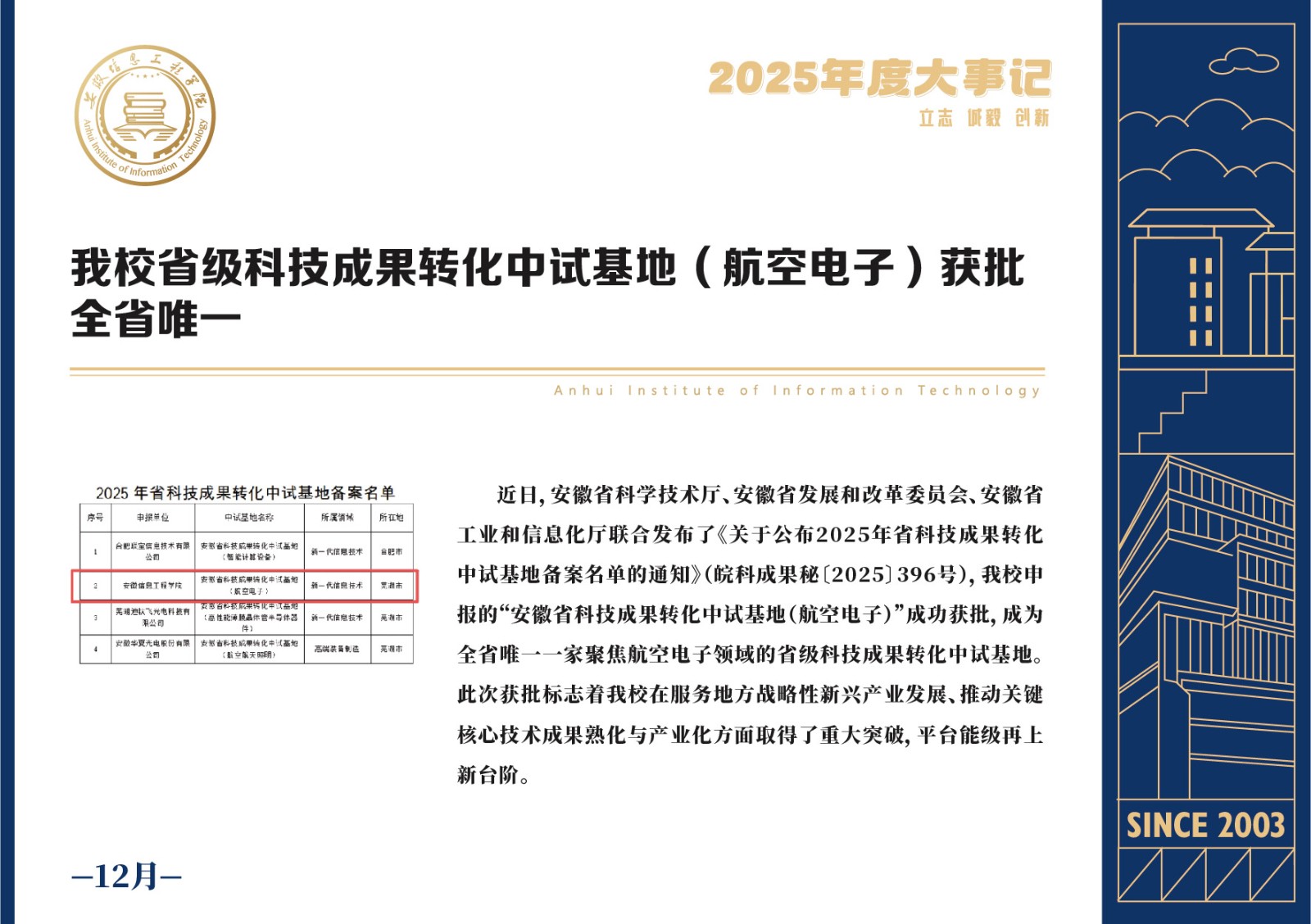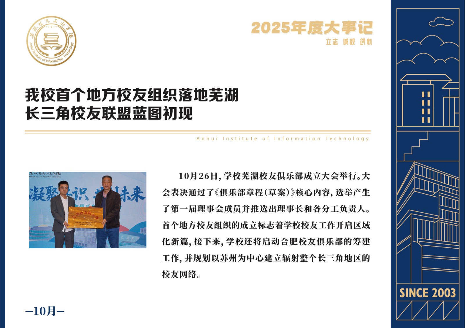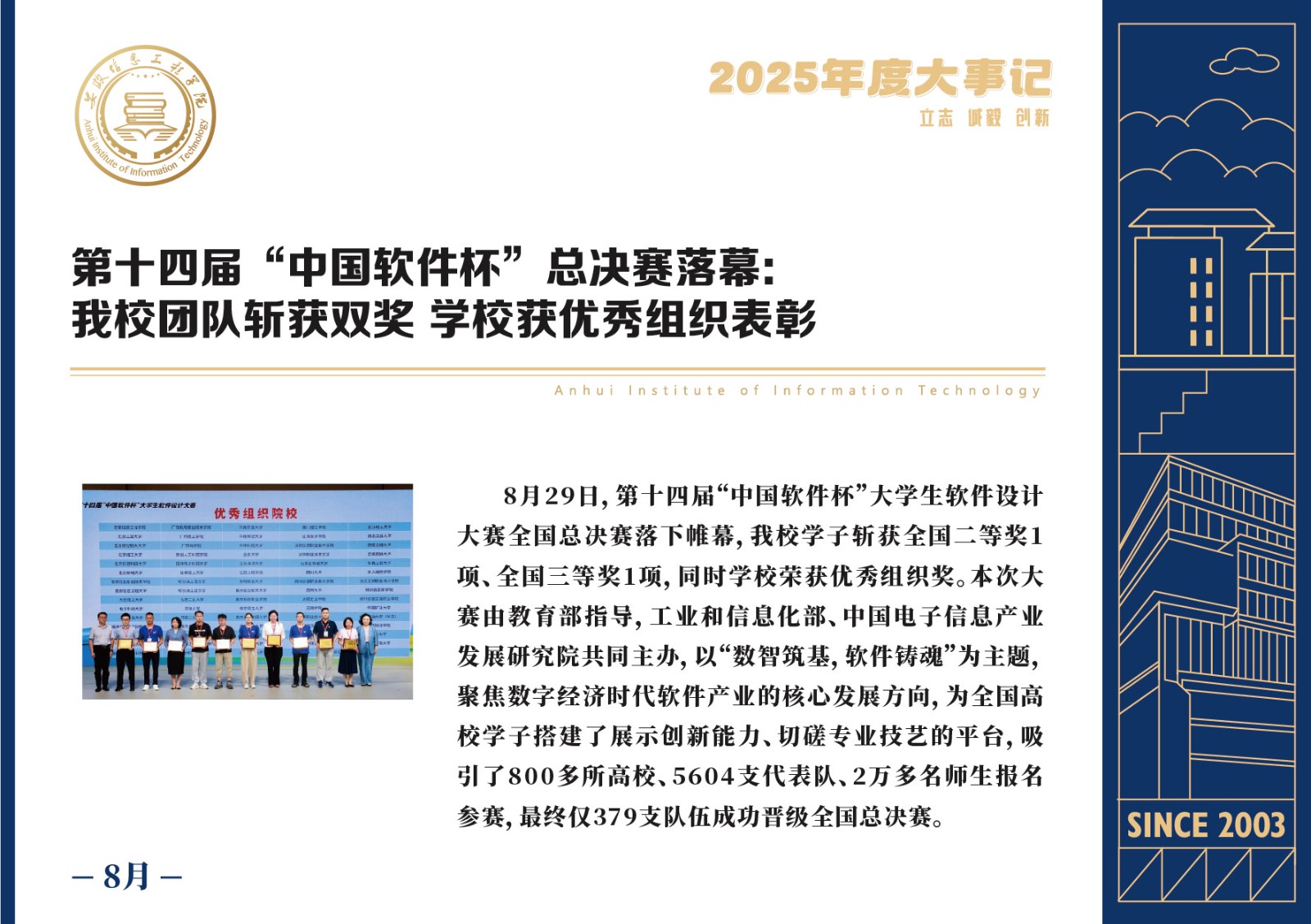 编者按 岁序更迭,华章日新。2025年,是安徽信息工程学院在高质量发展道路上勇攀新峰、跨越前行的一年。这一年,我们高举旗帜、培根铸魂,党的建设坚定有力。这一年,我们聚焦主业、锐意革新,人才培养与教育教学改革结出累累硕果。这一年,我们聚力创新、服务社会,科研能级与学科建设实现历史跨越。这一年,我们以生为本、涵养生态,育人环境与校园文化焕发勃勃生机……每一个事件,都凝聚着信工人的智慧与汗水,每一次跨越,都彰显着学校“为党育人、为国育才”的使命担当。