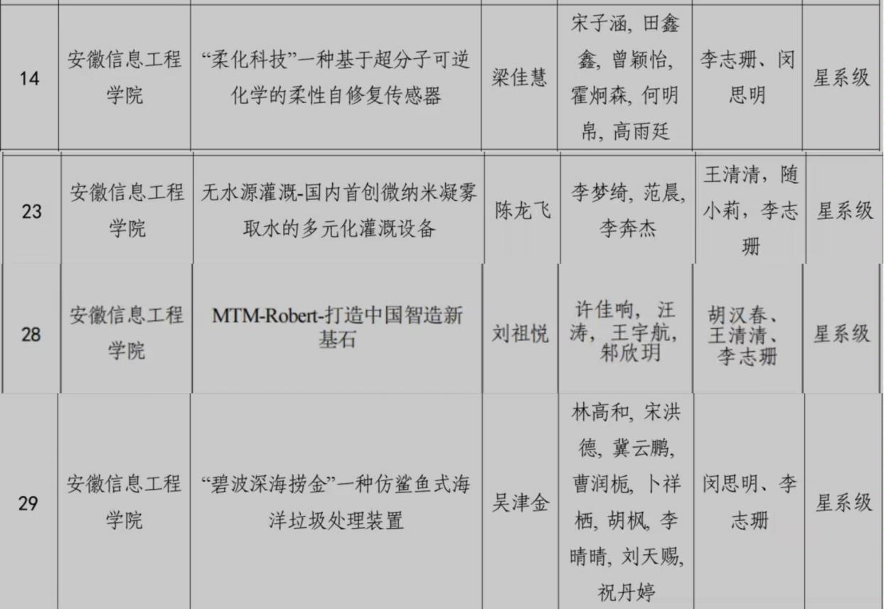 本网讯 近日,由团省委、省教育厅、省科协、省社科院、省学联共同举办的第十届“挑战杯”安徽省大学生课外学术科技作品竞赛黑科技展示活动落下帷幕,经过校赛和省级复赛,共有来自85所高校、299件作品进入省级决赛。经过决赛激烈角逐,学校《“柔化科技”一种基于超分子可逆化学的柔性自修复传感器》《无水源灌溉-国内首创微纳米凝雾取水的多元化灌溉设备》等12项作品荣获省级奖项,其中星系级奖4项、恒星级奖4项、行星级1项、卫星级3项。(图为星系级奖项名单)(图为恒星级奖项名单) (图为行星级奖项名单)(图为卫星级奖项名单) 为更好地参与此次“挑战杯”竞赛“黑科技”专项赛,学校多部门通力合作,积极动员各有关教研室专业教师主动参与,以百余项大学生创新创业训练计划项目为依托,从项目申报、遴选、组织参加省赛,全程周密部署,细致安排,共推荐15件“黑科技”作品进入到省赛环节。此次“黑科技”专项赛省赛成绩的取得是我校一直以来高度重视大学生创新创业工作的成果,更是我校青年学生创新意识和科研能力得到进一步提升的具体体现。