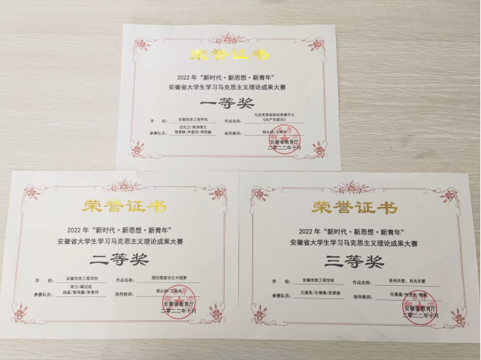 为深入学习习近平新时代中国特色社会主义思想,坚持用习近平新时代中国特色社会主义思想铸魂育人,激发大学生学习马克思主义理论的积极性、主动性和创造性,彰显新时代青年大学生的崭新风貌和昂扬斗志,马克思主义学院积极组织我校学子参加由安徽省教育厅主办、合肥工业大学承办的2022年“新时代·新思想·新青年”安徽省大学生学习马克思主义理论成果大赛。马克思主义学院通过校内选拔,最终提交的微视频作品喜获佳绩。在微视频创作赛项中,机械工程学院沈先卫等同学的团队作品《马克思恩格斯经典著作之<共产党宣言>》(指导教师郁从娟、王来凤)喜获一等奖;机械工程学院周力等同学的团队作品《理论微宣讲之中国梦》(指导教师郁从娟、王来凤)喜获省级二等奖;艺术设计学院王建美同学的作品《吾有所爱,其名华夏》(指导教师任晨晨、张贤法、樊晨)荣获省级三等奖。其中,郁从娟、王来凤两位教师被授予“优秀指导教师”荣誉称号。“新时代•新思想•新青年”安徽省大学生学习马克思主义理论成果大赛是我省马克思主义理论学科的唯一一项大学生学科与技能竞赛。共产党宣言>