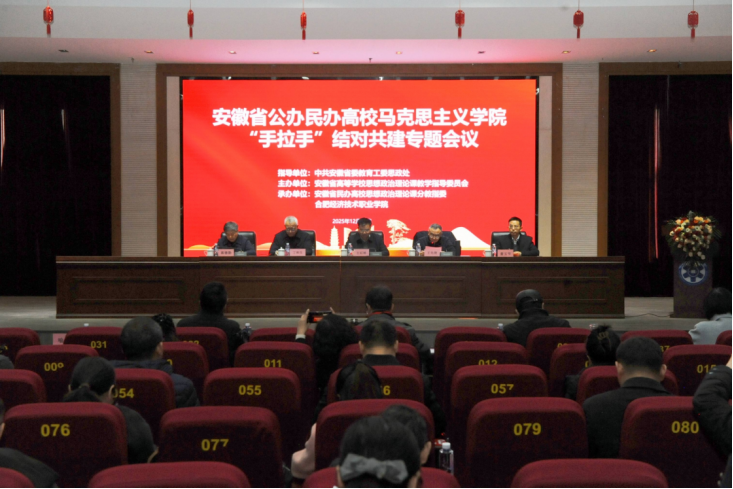 12月18日上午,安徽省公办民办高校马克思主义学院“手拉手”结对共建专题会议在合肥召开。会议由省委教育工委思政处指导,省高校思想政治理论课教学指导委员会主办,省民办高校思政课分教指委和合肥经济技术职业学院联合承办。全省24所重点马院、32所民办高校马院负责人、省高校思政课教指委领导和委员参加会议。省委教育工委、省教育厅思政处处长王后林莅临指导,省高校思政课教指委主任委员王先俊主持会议。我校马克思主义学院常务副院长胡安全教授参加会议。(图为会议现场)会上,王后林宣读结对共建文件,并代表省委教工委领导发表讲话。他指出,开展全省公办民办高校马克思主义学院“手拉手”结对共建,是深入学习贯彻习近平总书记关于学校思政课建设的重要指示精神、落实立德树人根本任务的重要举措,也是响应省委、省政府加快建设教育强省部署要求,破解民办高校马院发展瓶颈、推动全省高校思政工作协同发展的务实行动。他强调,要在师资队伍建设上实现“共育共享”,通过“一对一帮带”“联合教研”“协同分享”等方式,提升民办高校思政课教师的教研